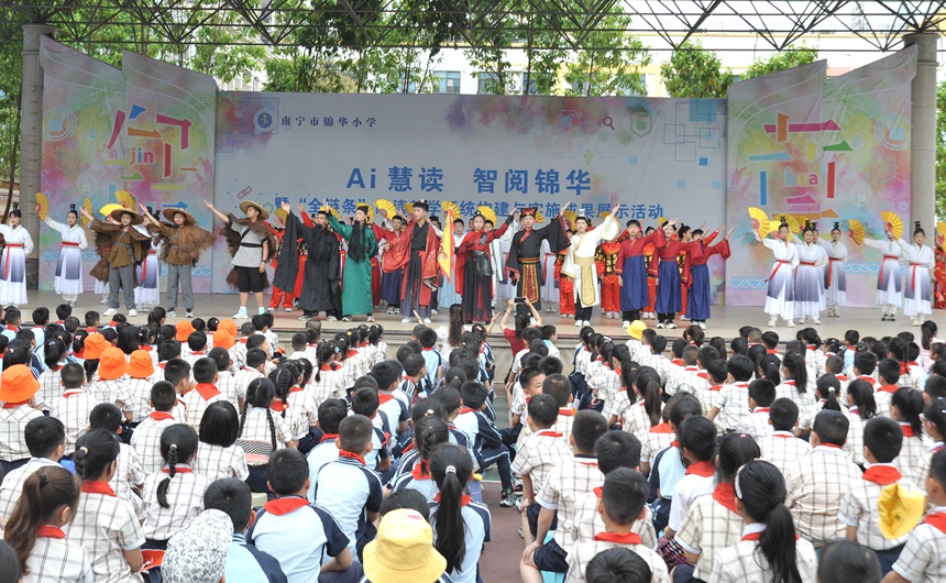 各年级精心编排的阅读主题展演构成沉浸式阅读矩阵:六年级《中华五千年》以诗舞辉映展现文化传承,南宁市锦华小学成功举办“AI慧读 智阅锦华”全链条阅读教学系统展示活动。三(7)班学生与智能机器狗联袂呈现的《智读新程 悦读启航》创新节目,学生通过与AI机器人的智能问答,通过经典与机械律动的艺术碰撞,在人机共读环节,(韦宇翔 曾勇倩)活动现场亮点频现。锦华小学校长宁永红在致辞中强调,不仅展示黏土插画、思维导图等创意作业,引导学生建立“阅读+生态”的跨学科思维。作家浩携科普著作《濒危猛禽》进校园与孩子开展“孩子与作家面对面”名师导读活动。让科技为书香校园注入持久动能。致力打造区域智慧教育示范校,赢得现场师生热烈掌声。为家庭教育提供示范样本。生动诠释AI赋能阅读的育人。