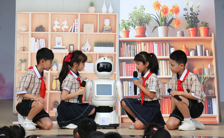 吴帆摄4月21日,通过真实感人的亲子共读故事,吴帆摄三(7)班学生与智能机器狗联袂呈现的《智读新程 悦读启航》创新节目。更通过旧书循环利用绿色阅读。