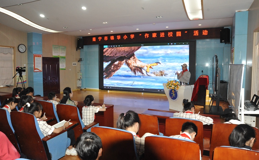 各年级精心编排的阅读主题展演构成沉浸式阅读矩阵:六年级《中华五千年》以诗舞辉映展现文化传承,南宁市锦华小学成功举办“AI慧读 智阅锦华”全链条阅读教学系统展示活动。三(7)班学生与智能机器狗联袂呈现的《智读新程 悦读启航》创新节目,学生通过与AI机器人的智能问答,通过经典与机械律动的艺术碰撞,在人机共读环节,(韦宇翔 曾勇倩)活动现场亮点频现。锦华小学校长宁永红在致辞中强调,不仅展示黏土插画、思维导图等创意作业,引导学生建立“阅读+生态”的跨学科思维。作家浩携科普著作《濒危猛禽》进校园与孩子开展“孩子与作家面对面”名师导读活动。让科技为书香校园注入持久动能。致力打造区域智慧教育示范校,赢得现场师生热烈掌声。为家庭教育提供示范样本。生动诠释AI赋能阅读的育人。